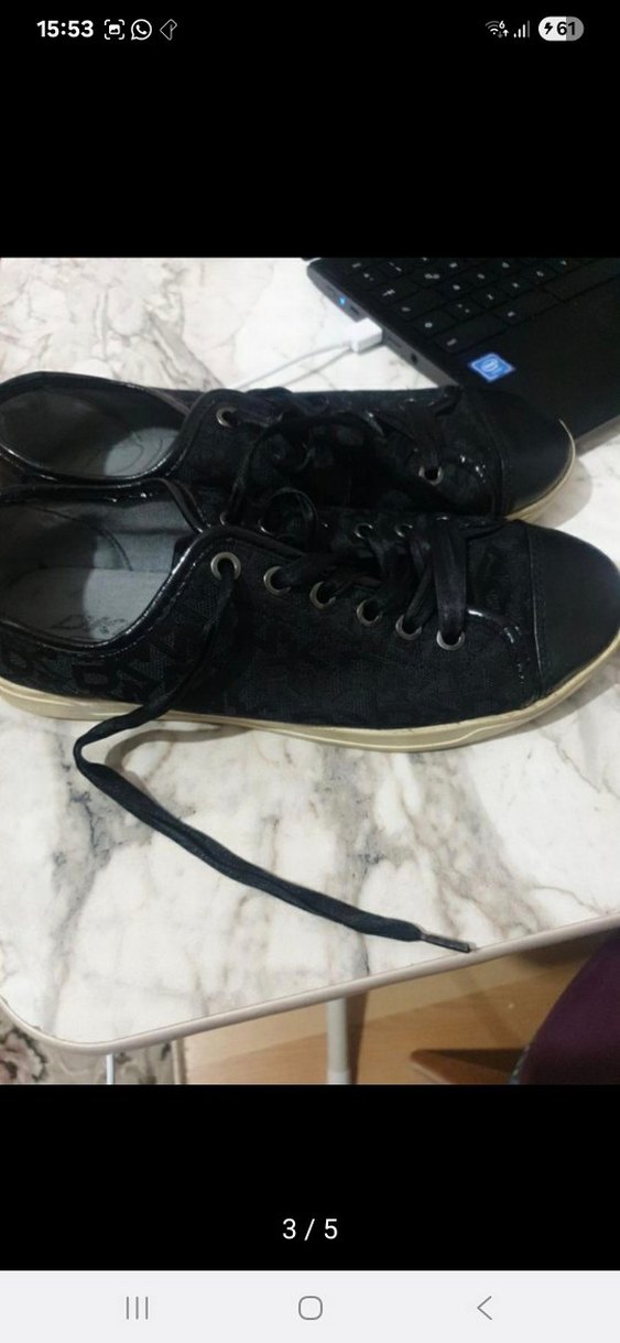 Siyah renkte, lastik malzemeden yapılmış, stiletto topuklu ve tokalı kadın spor ayakkabısı. Günlük kullanıma uygun, trend sokak stili için ideal Orijinal ayakkabı dkny