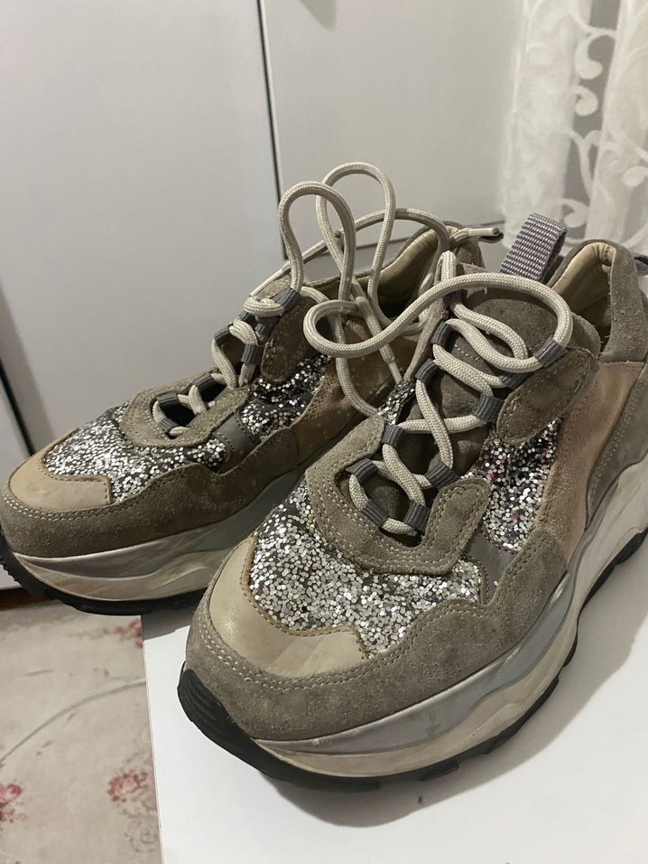 Bej süet malzeme ve yılan desenine sahip, bağcıklı, platform topuklu kadın spor ayakkabısı. Günlük sokak stili için uygundur. 37 numara sneaker yüksek taban topuk 3 4 cm