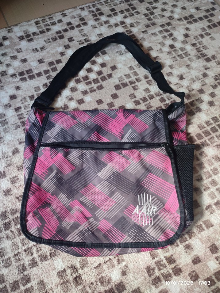 Kadın spor çantası, pembe ve gri baskılı desenli, fermuarlı 3 bölmeli ve ayarlanabilir askılı, günlük sokak tarzına uygun.