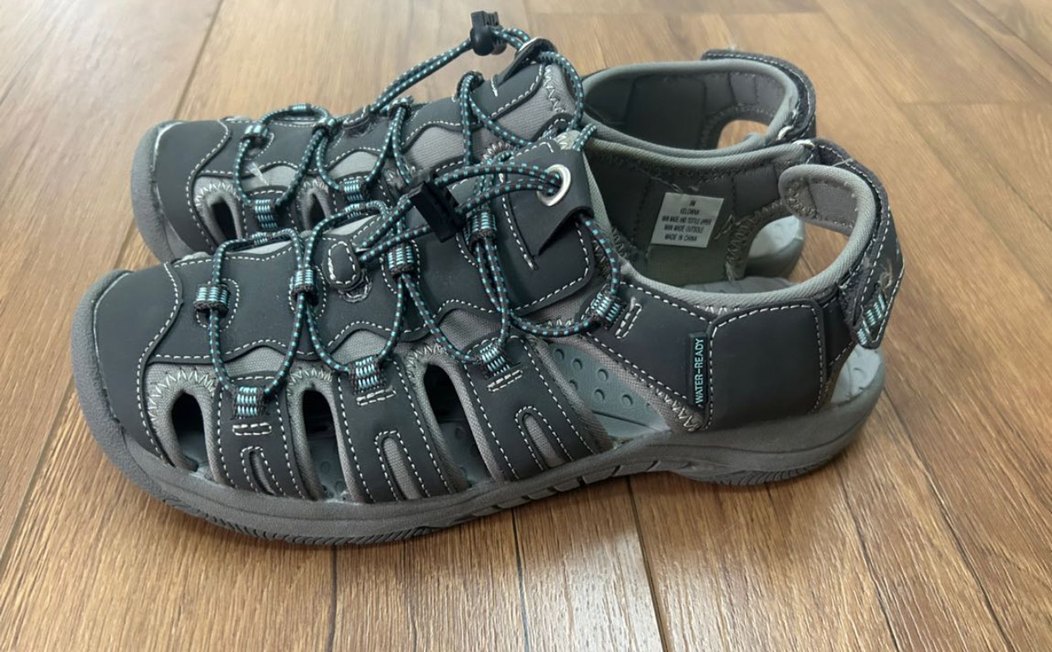 Gri renkli, kayışlı ve desenli kadın sandaletleri. Dayanıklı kauçuk malzemeden üretilmiş, dış mekan ve sokak stiline uygun. Trendy ve rahat bir görünüm sunar.