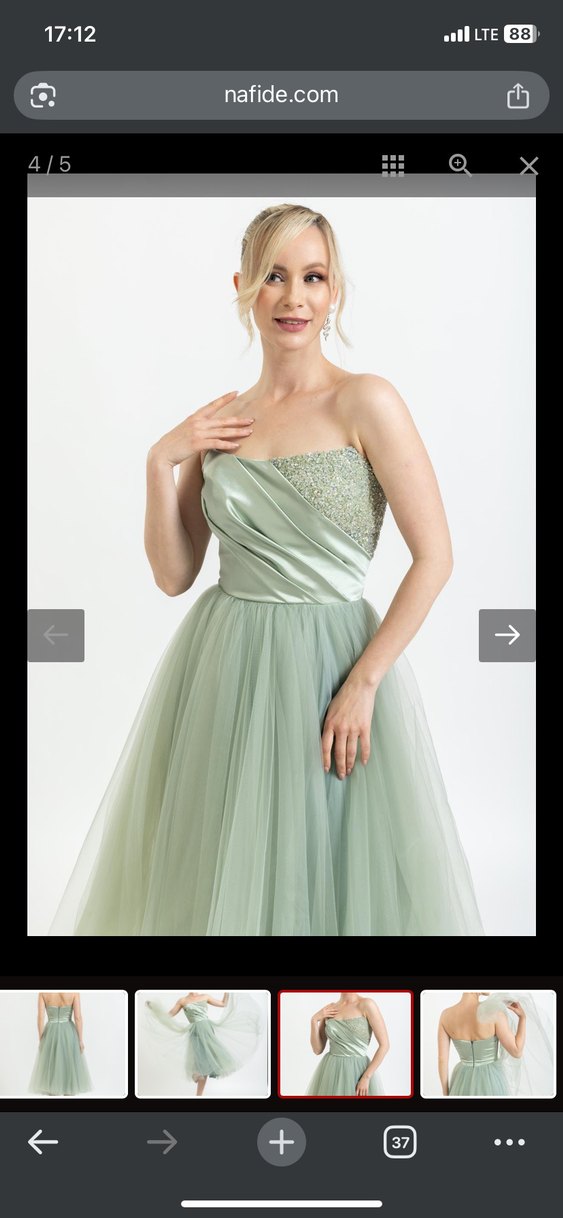 Kadınlar için straplez, drapeli ve hafif süslü midi abiye elbise. Klasik ve modern tarzda, düğünler için ideal, hafif haki tonlarında, kolsuz ve regular fit.