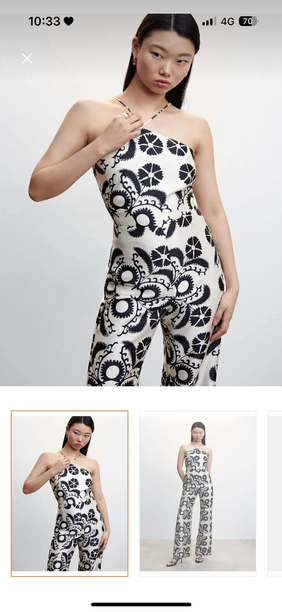 Straplez yakalı, kolsuz ve vücuda oturan bu tulum, siyah-beyaz desenli ve sentetik kumaştan yapılmıştır. Dantel detaylarıyla çağdaş ve günlük kullanıma uygundur.