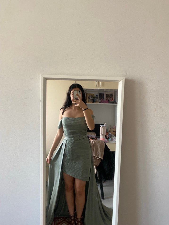 Bu haki straplez midi abiye elbise, drapeli detaylar ve askılı kollar ile dar kesim sunar. Minimalist ve çağdaş tasarımıyla romantik akşamlar için uygundur. Hiç giymedim