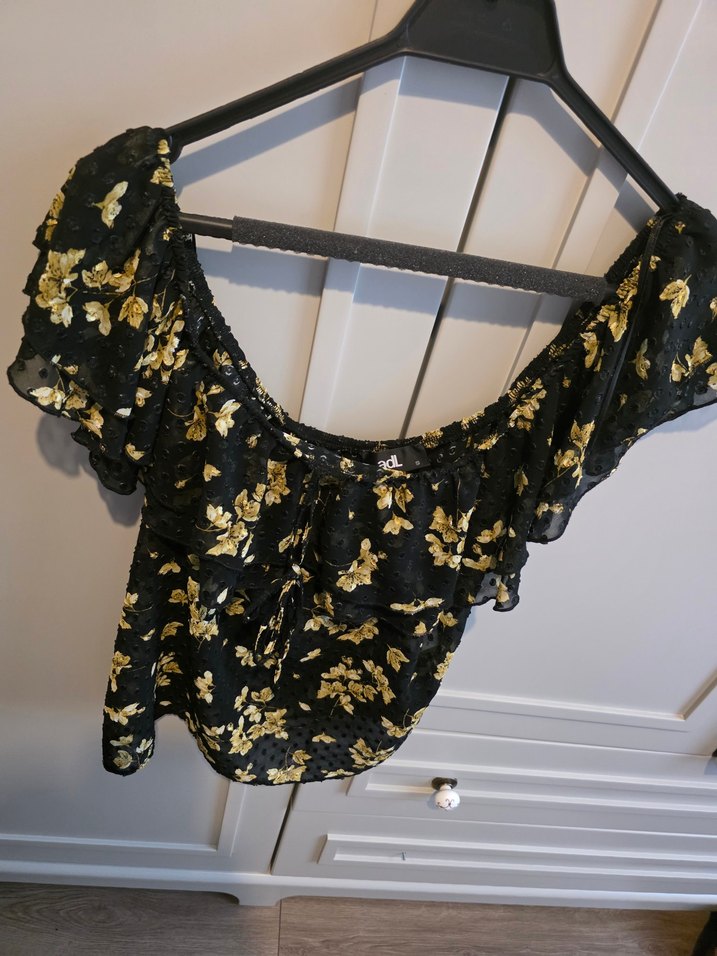 Kadın bluz, straplez yaka ve volan detaylı, askılı kısa mini kesime sahip. Sentetik kumaş, koyu altın renkli baskılı, bohem ve vintage tarzda, günlük kullanıma uygun. m l uyumlu