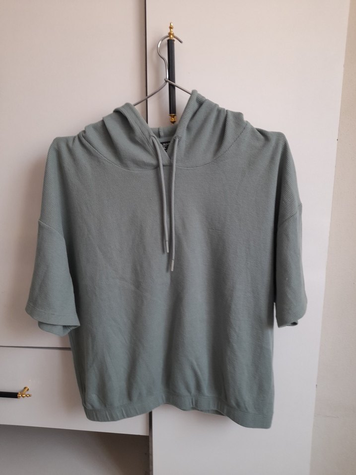 Kadınlar için su yeşili renkte, kapüşonlu, kısa kollu ve bol kesim sweatshirt. Günlük kullanıma uygun rahat bir sokak stili sunar.