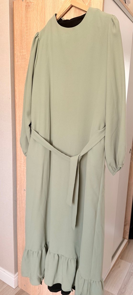 pastel tonlarda, uzun kollu, yüksek yakalı, salaş kesim, kemerli uzun elbise. Minimalist ve desensiz tasarıma sahip, günlük kullanıma uygun. SİTARE MARKASINA AİT TESETTÜR GİYİME DE AÇIK GİYİME DE UYGUN