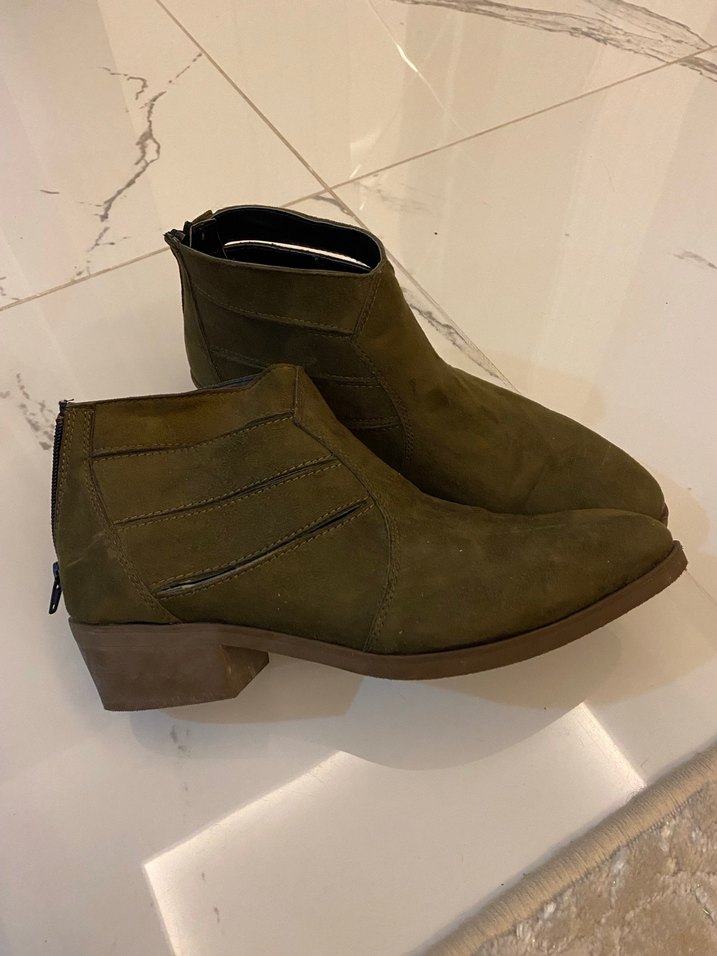 Kadınlar için süet malzemeden yapılmış, blok topuklu ve fermuarlı gri tonlarında bot. Minimalist ve desensiz tasarımıyla günlük ve sokak stiline uygun.