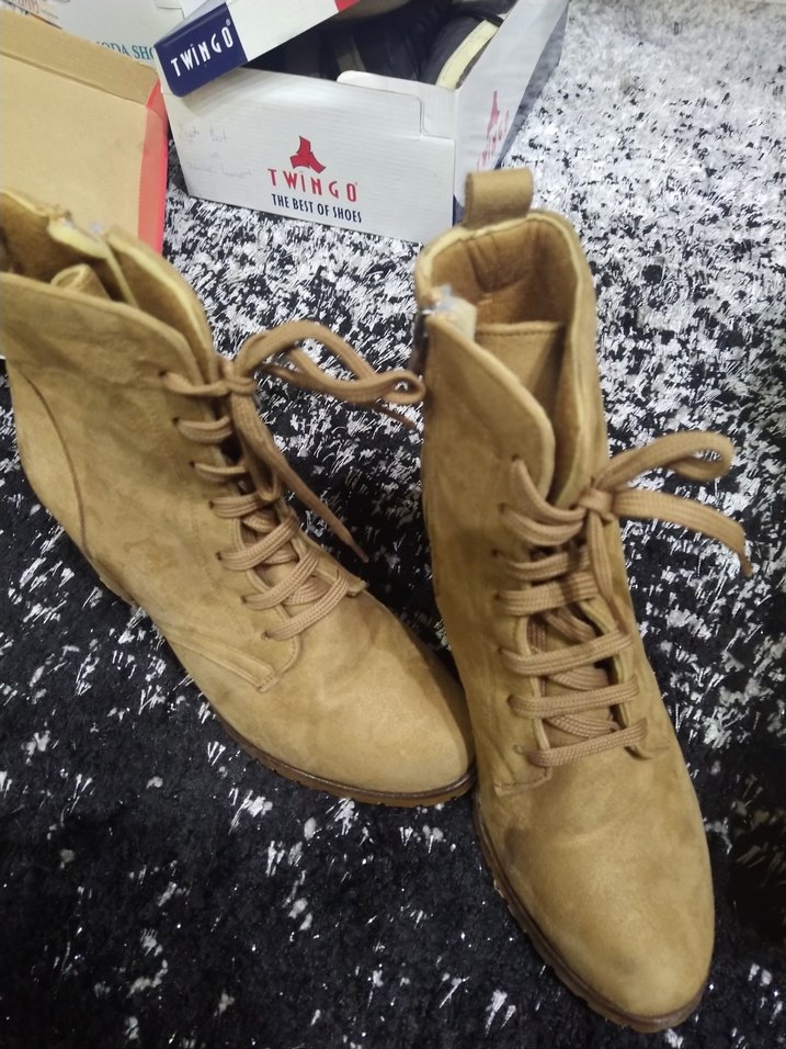 Kadınlar için kahverengi süet, bağcıklı ve topuklu botlar. Rahat sokak stili ve günlük kullanım için uygundur. İç kısmında mangomarkası bulunur.