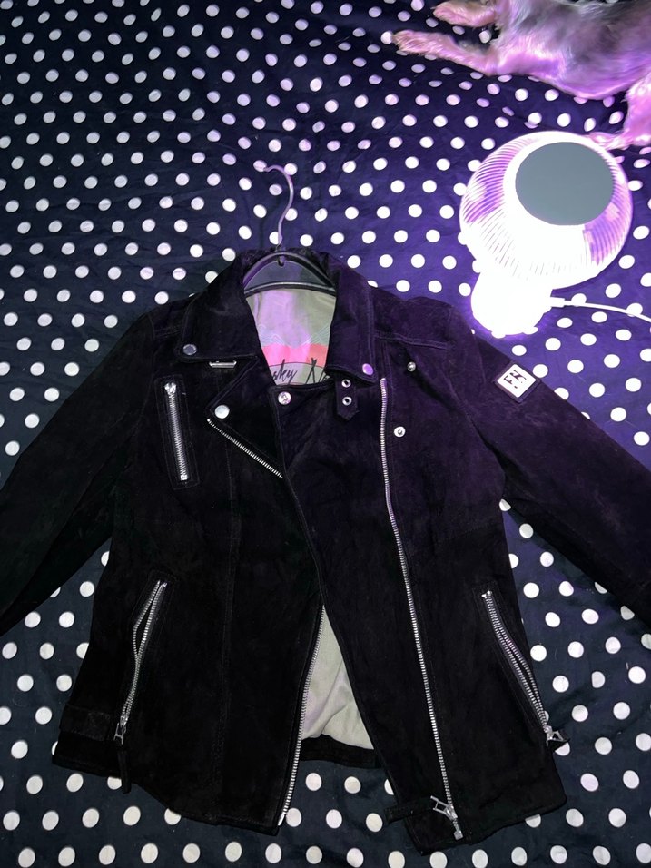 Fermuarlı, notched lapel yakalı, uzun kollu,suet ceket. Normal boyda m beden.