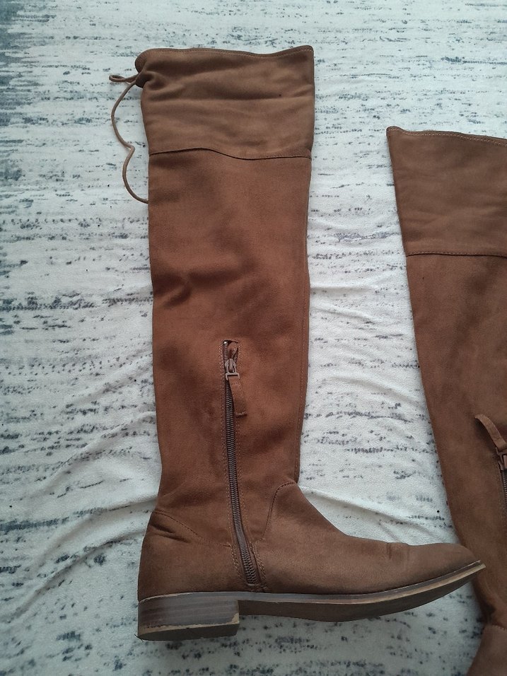 Kahverengi süet dizüstü çizme, stiletto topuklu ve fermuarlı. Rahat, bohem tarzıyla günlük kullanıma uygun.