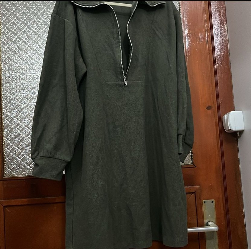 Uzun, bol kesim kadın süet tunik yüksek yakalı ve uzun kolludur. Fermuarlı detaylı, rahat ve şık sokak stili için uygundur.