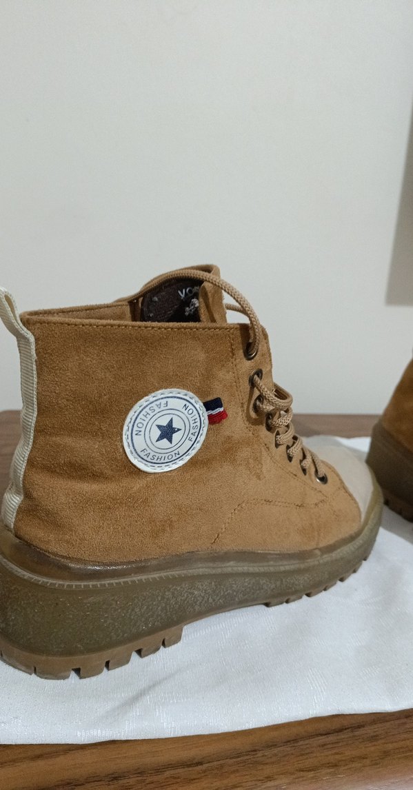 Açık kahverengi süet kadın botları, dolgu topuklu ve baskılı detaylara sahip. Kolay kullanım için cırt cırtlı, günlük sokak stiline uygun.