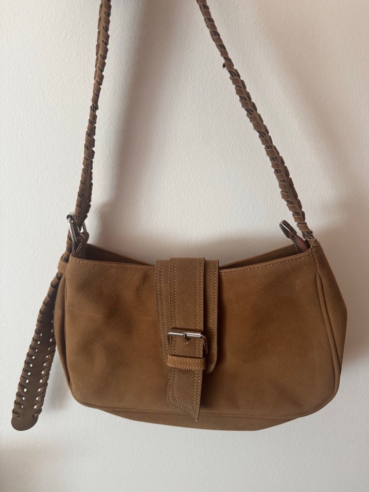 Yumuşak süet malzemeden üretilmiş, kemerli ve örgülü askılı bohem tarzda kadın çantası. Minimalist, desensiz tasarım, günlük kullanıma uygun.