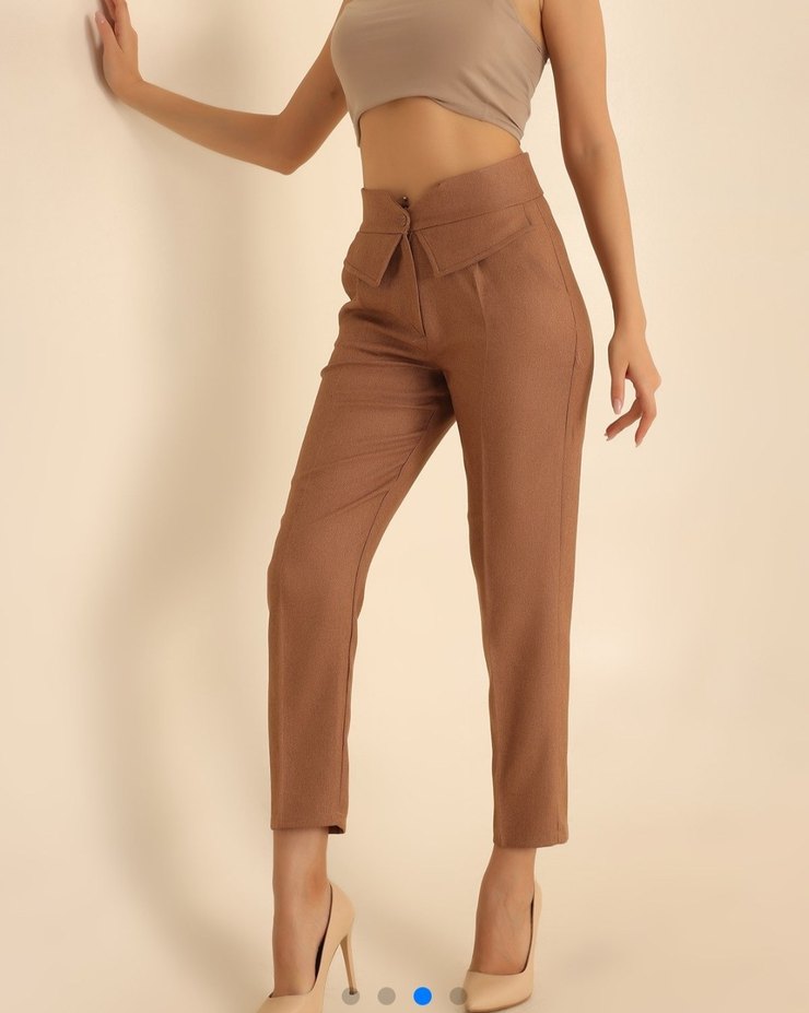 Kadınlar için camel renkli süet kumaştan, kemerli ve normal boyda, günlük kullanıma uygun rahat kesim pantolon. deforme yok sayılı giyildi
