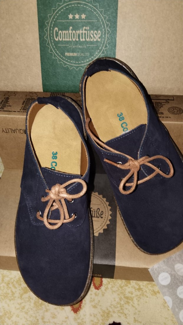 Tokalı, koyu mavi süet çocuk ayakkabısı. Desensiz ve normcore tarzında, 38 ve 38C numaralı bedenler mevcuttur. sıfır kutusunda gelir comfortfüBe Markasıdir