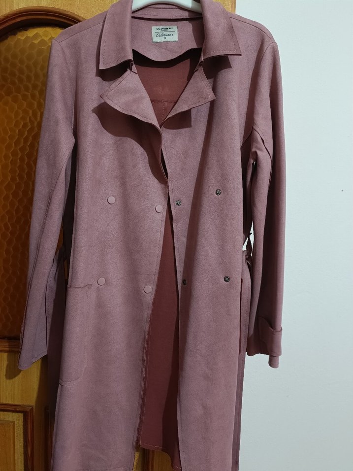 Kadınlar için süet malzemeden yapılmış, düğmeli ve uzun kollu uzun trençkot. Rahat kesimi ve yakasıyla günlük kullanıma uygundur.