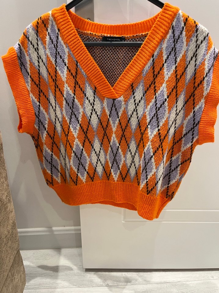 Renkli desenli, V yakalı, örgü, kolsuz kadın süveter. Rahat kesim ve midi boyda, bohem ve rahat sokak tarzına uygun.
