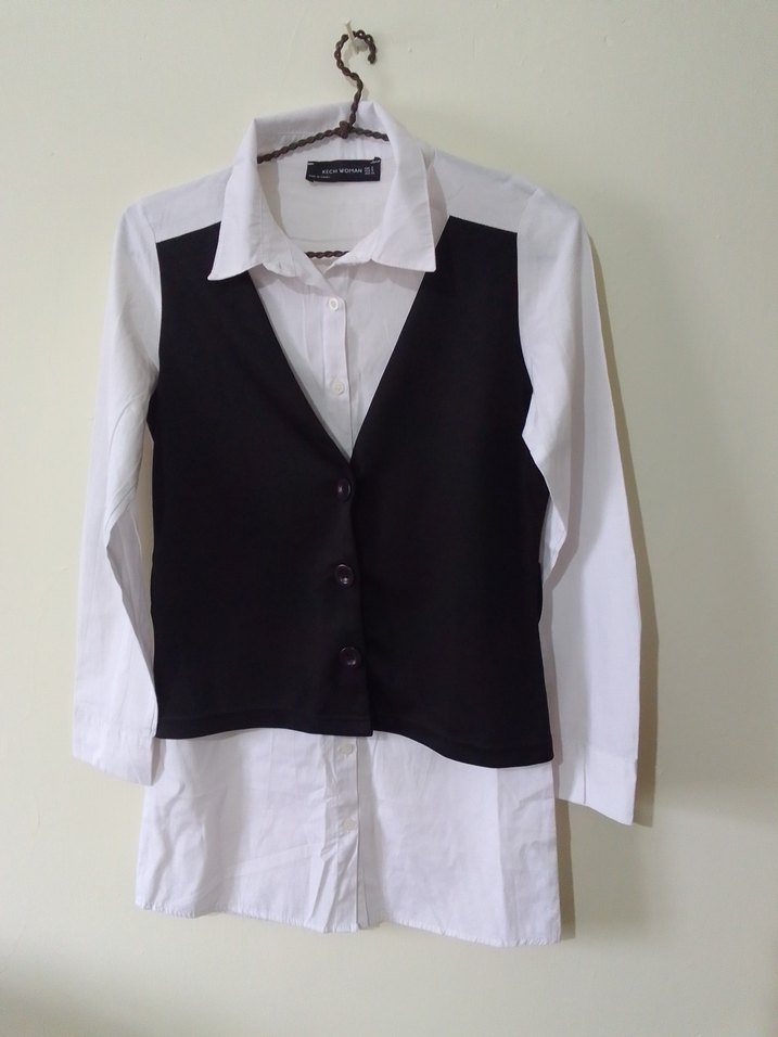 Beyaz pamuk gömlek, yakalı ve düğmeli önüyle. Kolsuz, normal kesim, ofis için uygun. Koyu renk yelek görünümlü klasik tarz.
