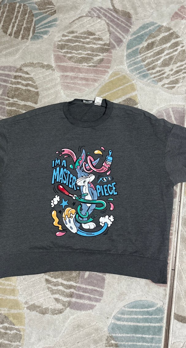 Gri, yumuşak ve sıcak kumaştan, baskılı desenli, kısa kollu, bisiklet yaka, bol kesim hamile tişörtü. Sokak stiline uygun rahat bir parça. yıkanmaua baglı baskısında kalkma var makul fiyat