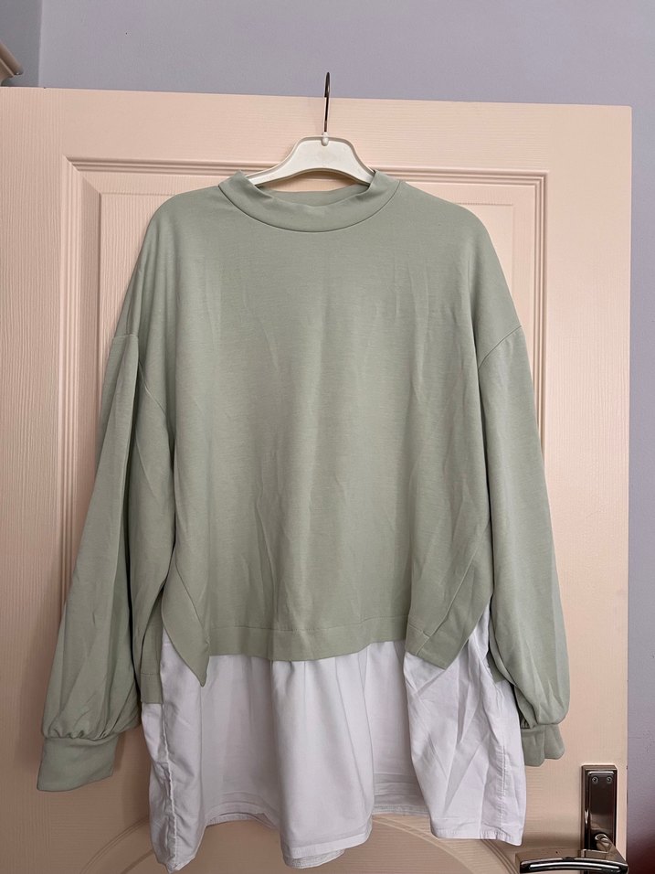 Hiçbir sorunu yok. Temiz kullanıldı. Yumuşak kumaştan, yuvarlak yaka ve uzun kollu, bol kesim kadın sweatshirt. Drapeli tasarımı ve pastel rengiyle günlük kullanıma uygun.