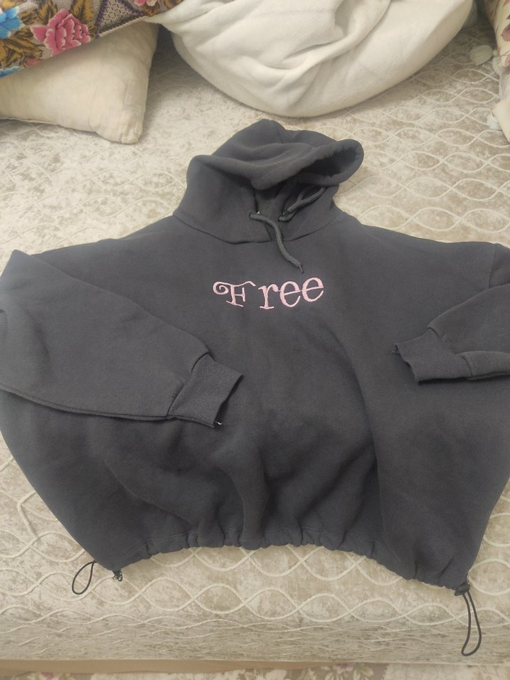 Kadınlar için kapüşonlu ve uzun kollu, bol kesim, yumuşak kumaştan, "Free" nakışlı ve fırfır detaylı trend günlük gri sweatshirt az kullanıldı defosu yok