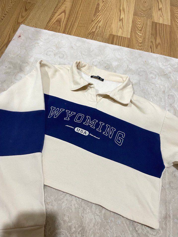 Kadınlar için uzun kollu, polo yakalı ve bol kesim beyaz sweatshirt. Lacivert baskılı şerit ve 'WYOMING USA' yazısı bulunur. Pamuklu ve rahat.