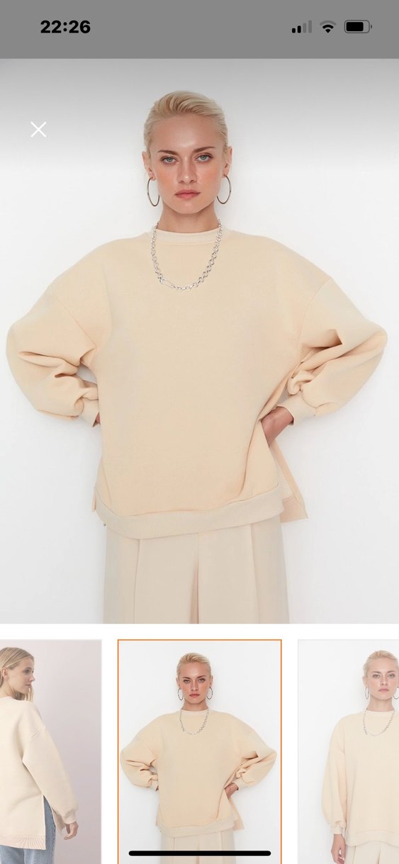 Pamuk kumaştan, bej renkte, oversize kesim ve yuvarlak yaka uzun kollu minimalist sweatshirt. Günlük rahat kombinlere uygun.