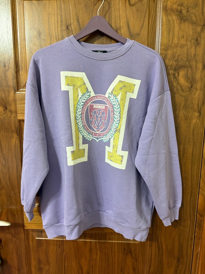 Mor renkli, yuvarlak yaka ve uzun kollu, rahat kesim kadın sweatshirtü. Ön kısmında baskılı desen ve örme kumaş kullanılmıştır.