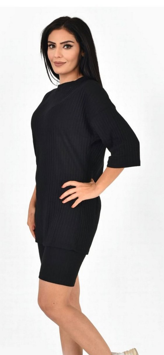 Siyah renkli, pilili dokulu, bisiklet yaka ve kısa kollu triko elbisedir. Düzenli kesim ve kısa boydadır, ofis için uygundur. üç renk kase dokulu pamuk kumaş takım
