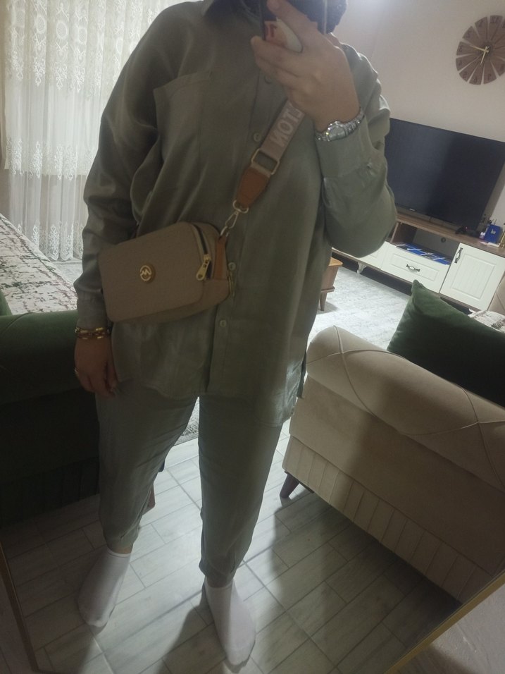 Kadınlar için bol kesim, kısa, kemerli deri ceket. Khaki renk, yakalı ve gri askılı kollara sahip, günlük sokak tarzına uygun.