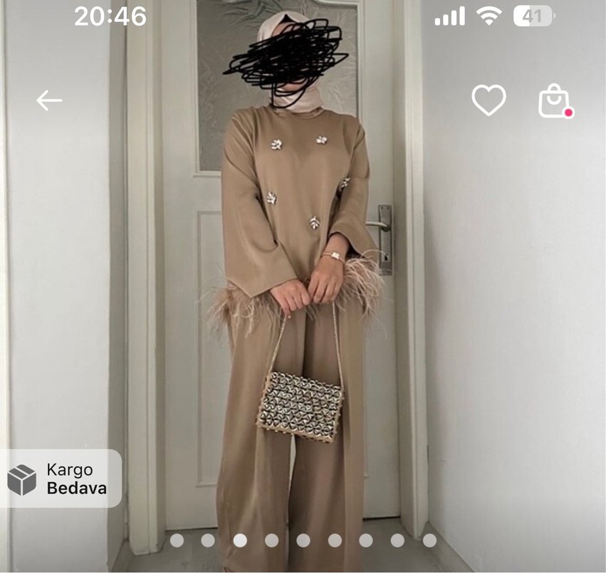 Sütlü kahve , uzun kollu ve yüksek yakalı, püskül ve taş detaylı,kadın takımı. Kadriye Baştürk 36 beden
