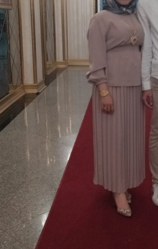 bir kez giyildi temiz ürün 38 40 beden uyumlu taş renginden etekli takım