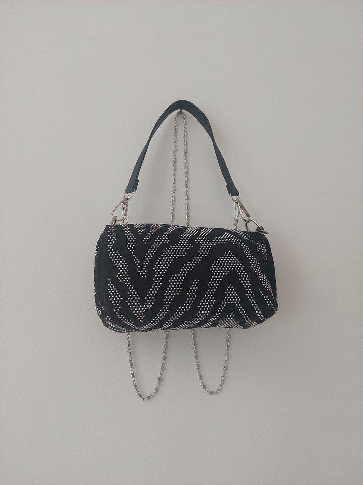 Siyah renkte, zebra desenli ve zincir detaylı kadın çantası. Sentetik kumaştan, sokak modasına uygun, günlük kullanıma uygun.