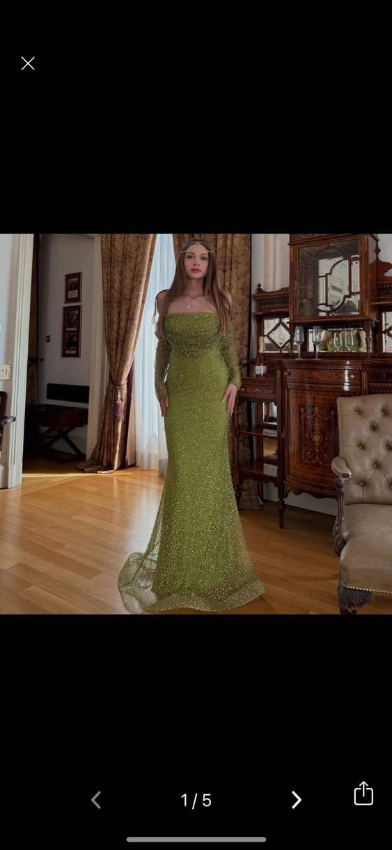 Bu kadın abiye elbise, parlak taşlar ve uzun kollu, kayık yaka detaylarına sahiptir. Sadece birkez ve birkaç saat giydim rengi çokk canlı ağır taşlı parlıtlı bir abiye ✨ Bayılacaksınızzz ve herkes bayılacakkk Herhangi bir defosu problemi yoktur İade yoktur.