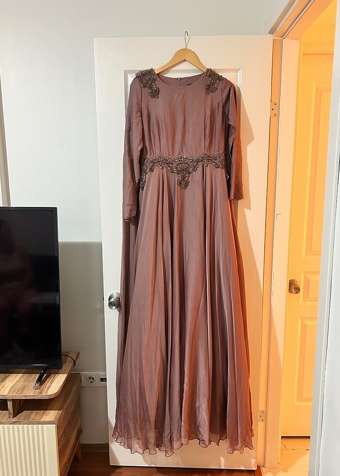 yalnızca bir kez giyildi koyu lila ve bordo arası bir renkte 42 beden şalı mevcut aynı renkte aynı kumaşta sadece arka fermuar kısmında küçük bir zedelenme mevcut ancak şal takıldığında o kısım kapanıyor onun dışı sağlam tertemiz fiyatta yardımcı olabilirim giyilmiş hali de var isterseniz fotoğrafını eklerim