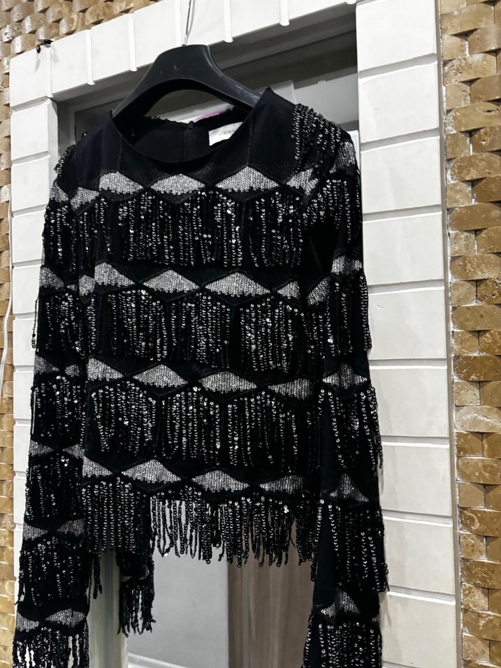 Uzun kollu, yuvarlak yakalı, siyah ve nakışlı bu triko bluz, kısa mini boyda ve dar kesimdir. Yumuşak sentetik kumaştan yapılmış olup, parti için uygundur. Ozel gün takım