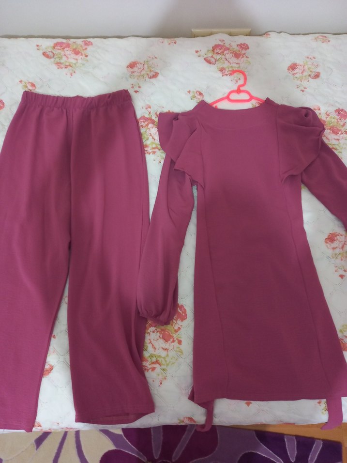 Pantolon-tunik takım. Mevsimliktir. Birkaç kez giydim artık giymiyorum. Kolye de dolabımda mevcut. 38-40 beden uyumludur.