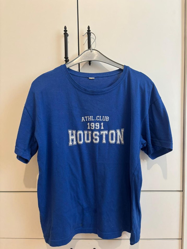 Mavi pamuklu tişört, kısa kollu, yuvarlak yaka ve bol kesimdir. Üzerinde '1991 HOUSTON ATHL.CLUB' baskısı bulunur, spor ve günlük kullanıma uygundur. ♀️