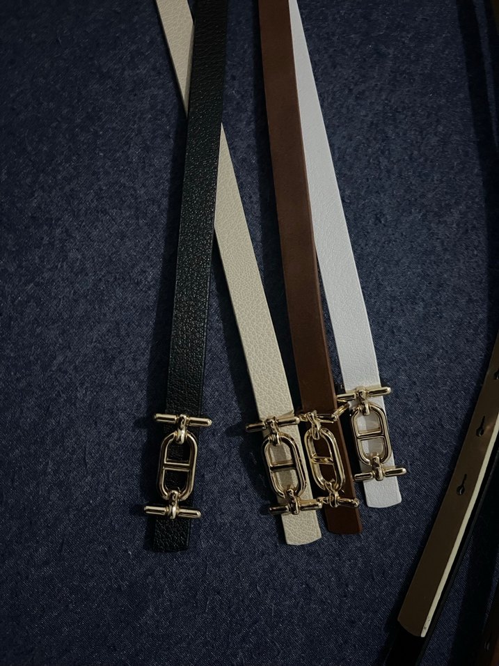 Gri, kahverengi, siyah ve beyaz renklerde, altın tokalı kadın kemer seti. Modern Paris tarzını yansıtıyor.