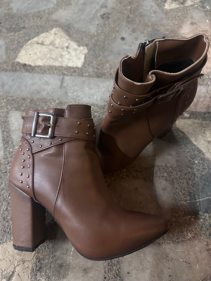 Kahverengi deri kadın botlar, blok topuklu ve tokalıdır. Perçin detaylarıyla sokak stiline uygun, günlük kullanıma ideal botlar. Sorunsuz marka temsili