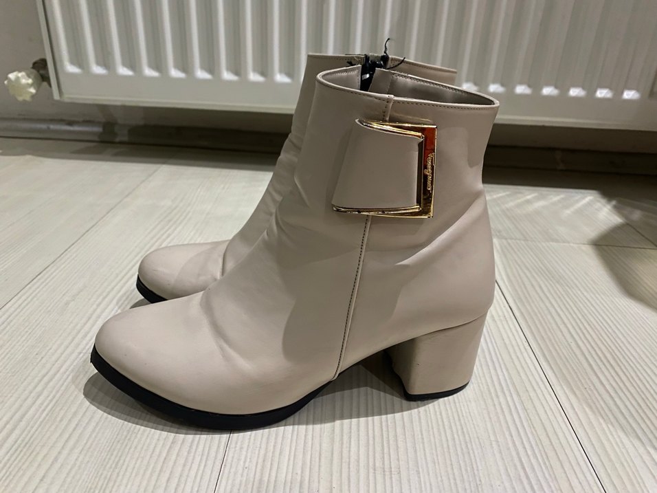 Bej deri kadın bot, kalın topuklu ve tokalı detaylı. Yanında fermuar bulunur, modern ve şık bir görünüme sahiptir.