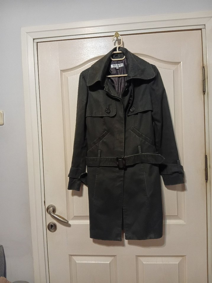 merhaba kadın trençkot, 36 beden sayılı kullanıldı, arkadan yırtmaçlı, mezura ölçüsü beden iki kol arası 45 cm ,bel ölçüsü 42 cm ,kol boyu 61 cm ,boy uzunluğu 89 cm ,astarlı kalın soğuk havalarda giyilebilir.