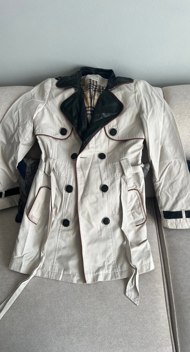 Krem rengi, yakası deri görünümlü siyah.