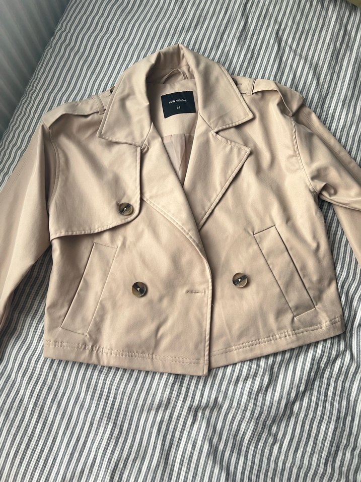 Bu bej deri trençkot, düğmeli kapama ve kırmalı yaka detaylarına sahiptir. Uzun kollu ve bol kesim, günlük sokak stili için uygundur.