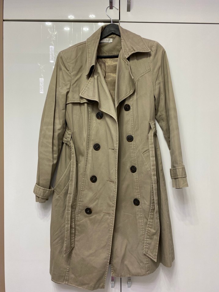 Bej renk, düğmeli, keten kumaştan midi uzunlukta trençkot. Notlu yaka ve uzun kollu, bol kesim, günlük sokak stili için uygun.