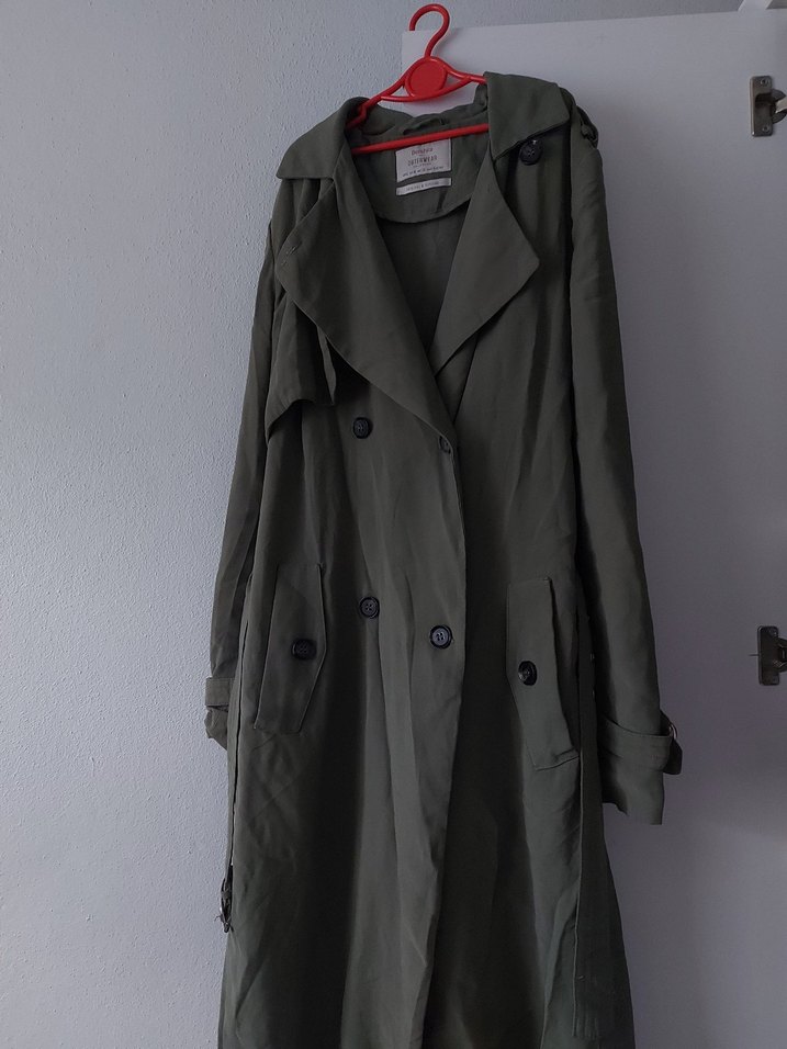 Kadınlar için uzun kesim, düğmeli, notched yakalı ve bol kesim trençkot. Sentetik kumaştan, minimalist ve sokak stili, uzun kollu ve desensiz, günlük kullanıma uygun.