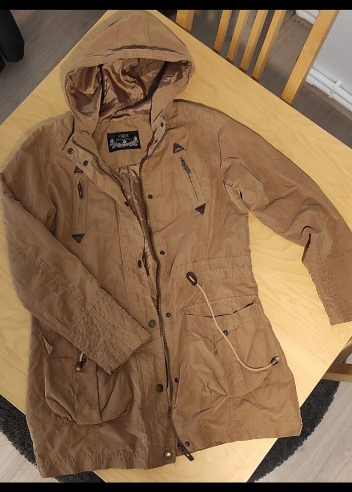 rengi ve kumaşı harika. yumuşacık, ütü vs istemez. çok şık trençkot. beden olmadığından satılık yoksa çok güzel bir ürün asla satmazdim. öndeki deri kısımlarında çok küçük atmalar olmuş ancak neredeyse hiç görünmüyor.