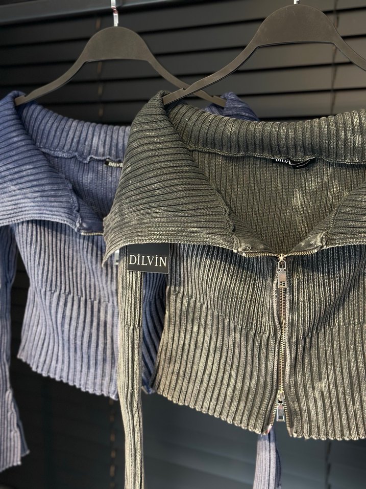 Triko denim kumaştan,yırtmaç kollu, madonna yaka ve fit kesimli kadın kazak. Alt üst fermuarlı ve DILVIN markalı, tie-dye desenlidir. İndigo ve antrasit renkli standart bedendir.