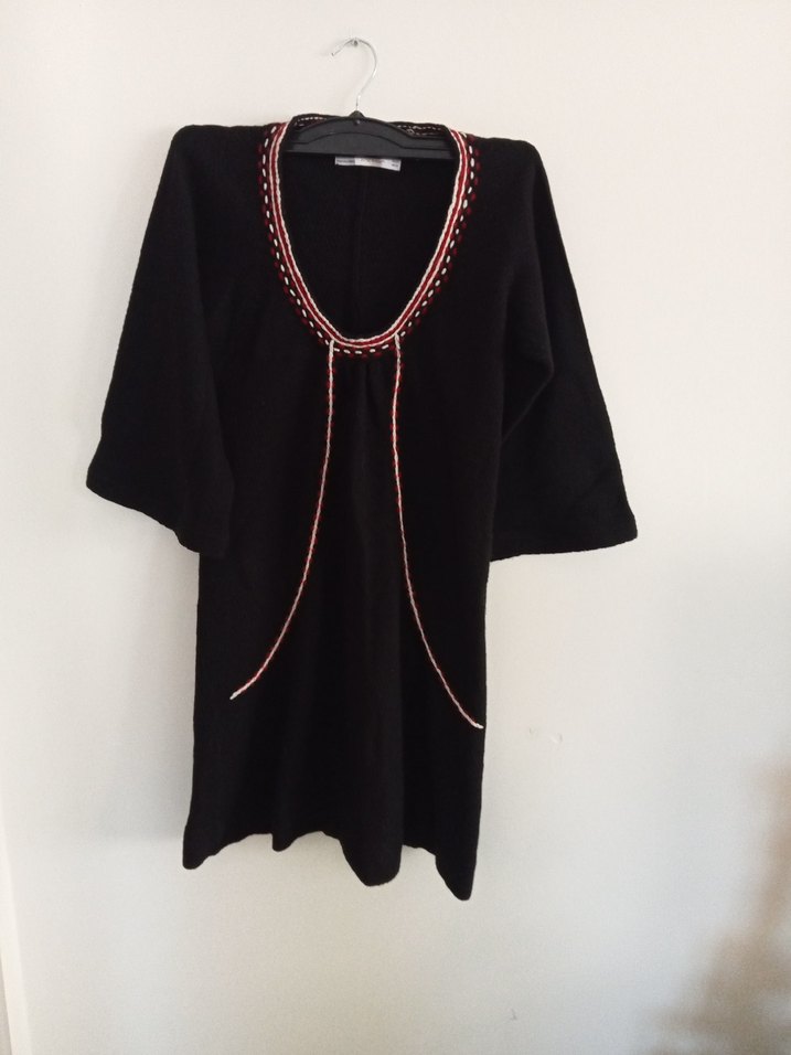 Siyah örme kumaştan, uzun kollu ve V yaka tunik. Nakış detaylarıyla bohem tarzı yansıtır, bol ve uzun kesimi günlük kullanım için uygundur. boy 90 cm iki koltuk arası 42 cm M beden esnek triko elbise kolları hafif İspanyol sorunsuz dur