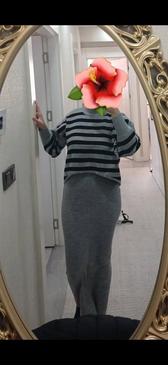Boğazlı, uzun kollu, çizgili ve triko kumaştan yapılmış, vücuda oturan midi boy gri elbise. Günlük rahat kullanım için uygundur. Hiç giymedim likralı esnek kış için çok uygun M-L uygun boyum 1.70